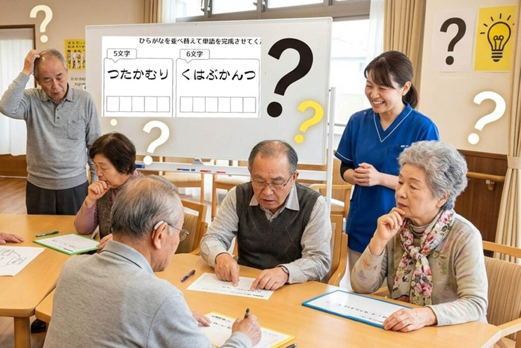【脳トレクイズ】 皆でワイワイと知恵を出し合う脳トレクイズの時間は、笑い声が絶えない人気コーナー。ポジティブな刺激が、脳をイキイキと活性化させてくれます。